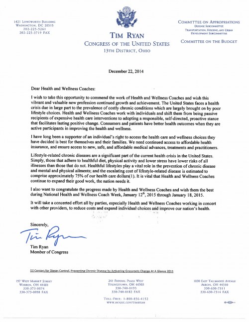 Recently U.S. Congressional Representative Tim Ryan commended the work of health and wellness coaches as valuable professionals in the health care industry. Here is his letter: