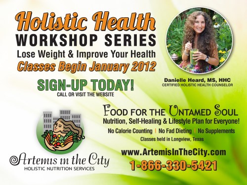 LONGVIEW, TX December 19, 2011 – Beginning January 2012, Artemis in the City, LLC, will launch a new holistic health and nutrition workshop series in East Texas titled “Food for the Untamed Soul” Nutrition, Self-Healing & Lifestyle Plan for Everyone!