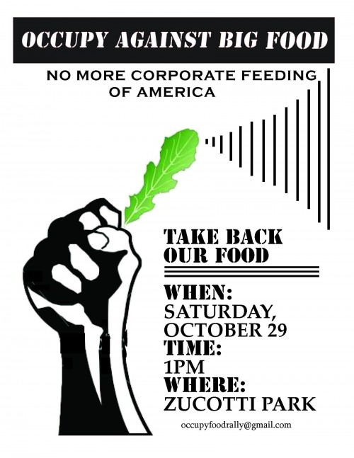 It is time we put a stop to the corporate manipulation of our food and agriculture policies and farming practices and take back our food! This Saturday, October 29, 2011 from 1:00 PM - 4:00 PM in New York City, Occupy Against Big Food will be held in Zucotti Park. The organized event will include food policy leaders such as Marion Nestle, PhD and Anna Lappe, MA. According to Nestle, "The food movement's goal is to make the food system healthier for people and the planet. That goal is entirely consistent with the goals of everyone in the Occupy Wall Street movement." Concerns that corporations have profited from poisoning our food supply, monopolizing farming practices and torturing animals are all clearly outlined in the first official statement released by Occupy Wall St.