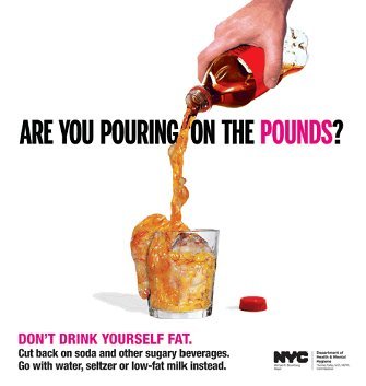 "Are you pouring on the pounds?" In an effort to encourage New Yorkers to cut back on sugary beverages, the New York City Health Department is urging New Yorkers to think about the sugar-sweetened beverages they are drinking. The image used in the new public service campaign ad is a soda, sports drink or sweetened ice tea beverage that is turning to fat as it is being poured into glasses. The main message is, "Don't drink yourself fat." This campaign is another great effort by New York City to help improve the health of New Yorkers while sending a message to the world that it is a health conscious city. To read the recent August 31, 2009 press release click here.