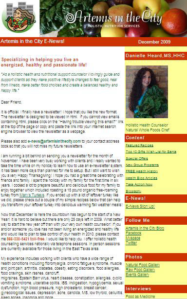 On Wednesday, February 17, 2010, Danielle Heard, MS, HHC, of Artemis in the City was featured in an article titled "East Texans Embrace Food as Medicine and Regain Their Life," in The Gilmer Mirror newspaper.