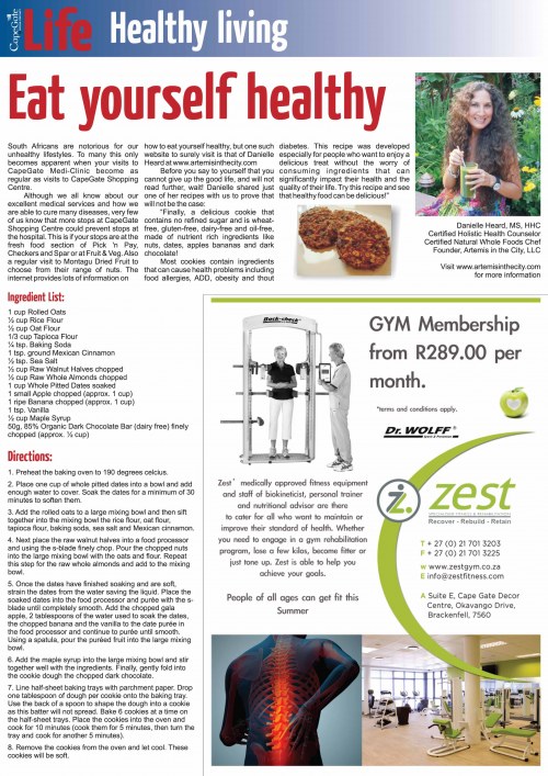 Artemis in the City is excited to announce that one of our delicious recipes is featured this month in the December 2012 issue of CapeGate Life Magazine. The magazine is published for the CapeGate Shopping Precinct which is located in Cape Town, South Africa and has a circulation of 40,000!